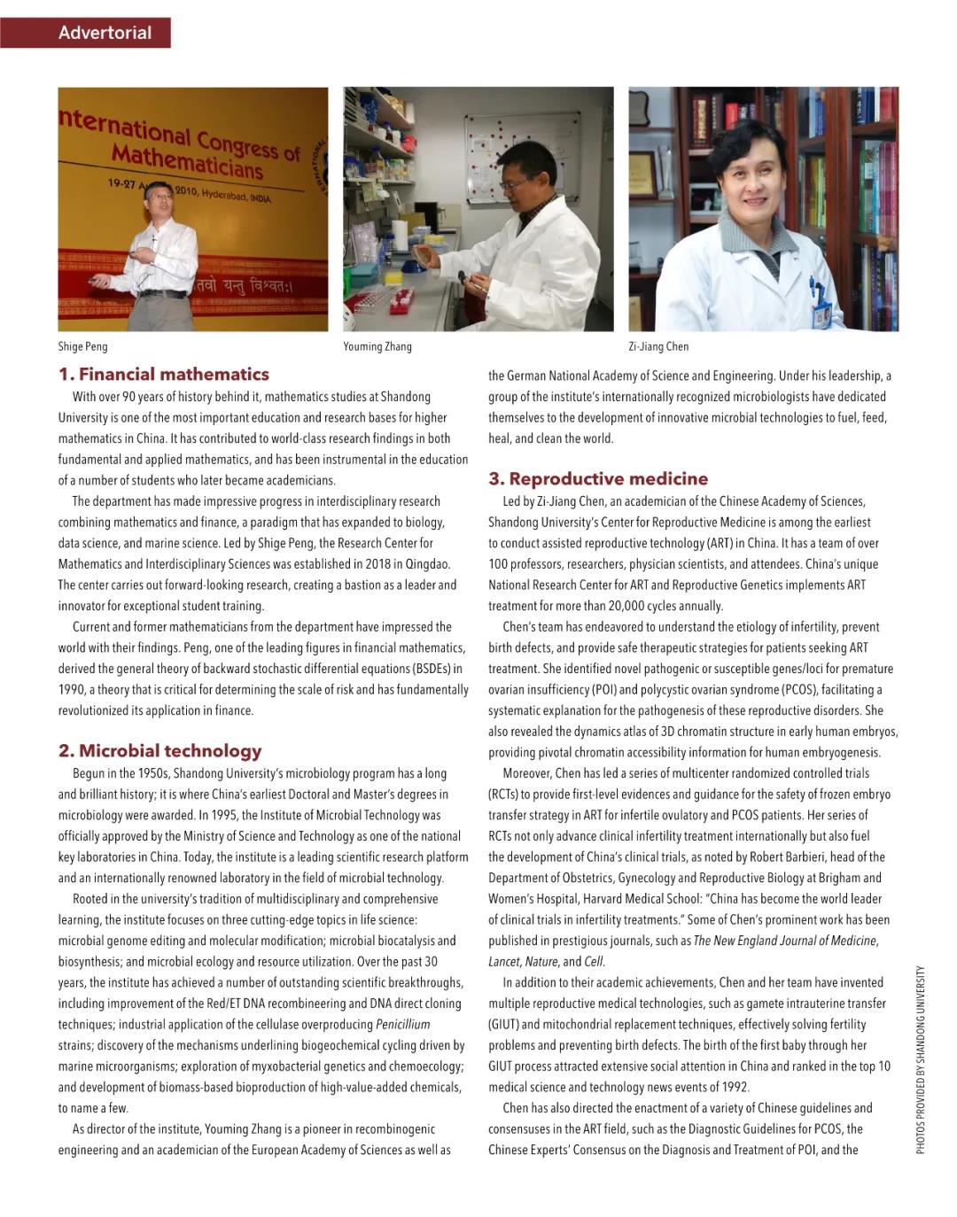 In addition, the report mainly focuses on the university's six dominant disciplines and key areas of introduction. The first part focuses on the discipline of financial mathematics, showing the research history of academician Peng Shige and his team. The second part introduces the State Key Laboratory of Microbial Technology, and reports the breakthroughs made by academician Zhang Youming and his team. The third part presents the cutting-edge research carried out by the reproductive medicine discipline team led by Academician Chen Zijiang.
